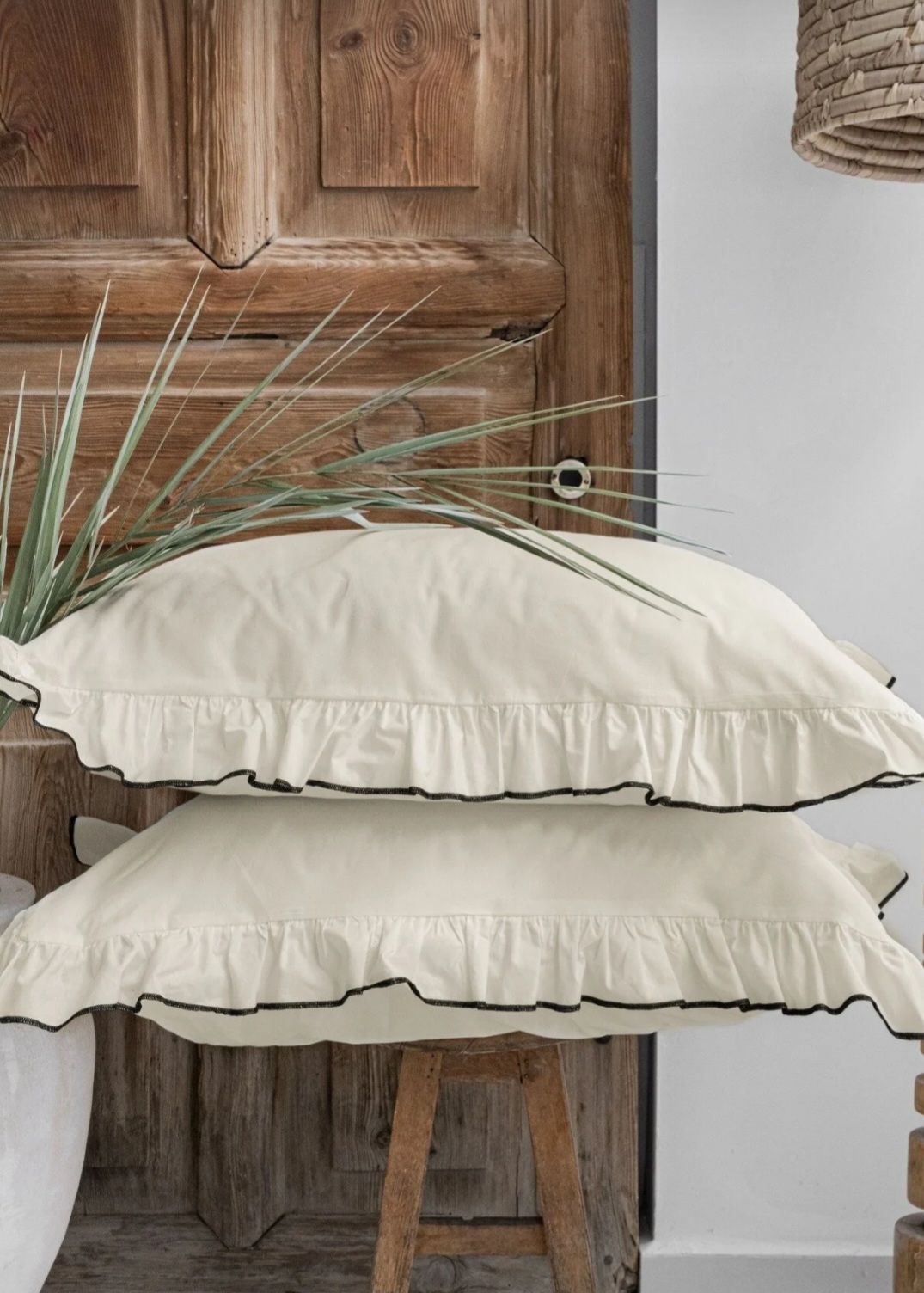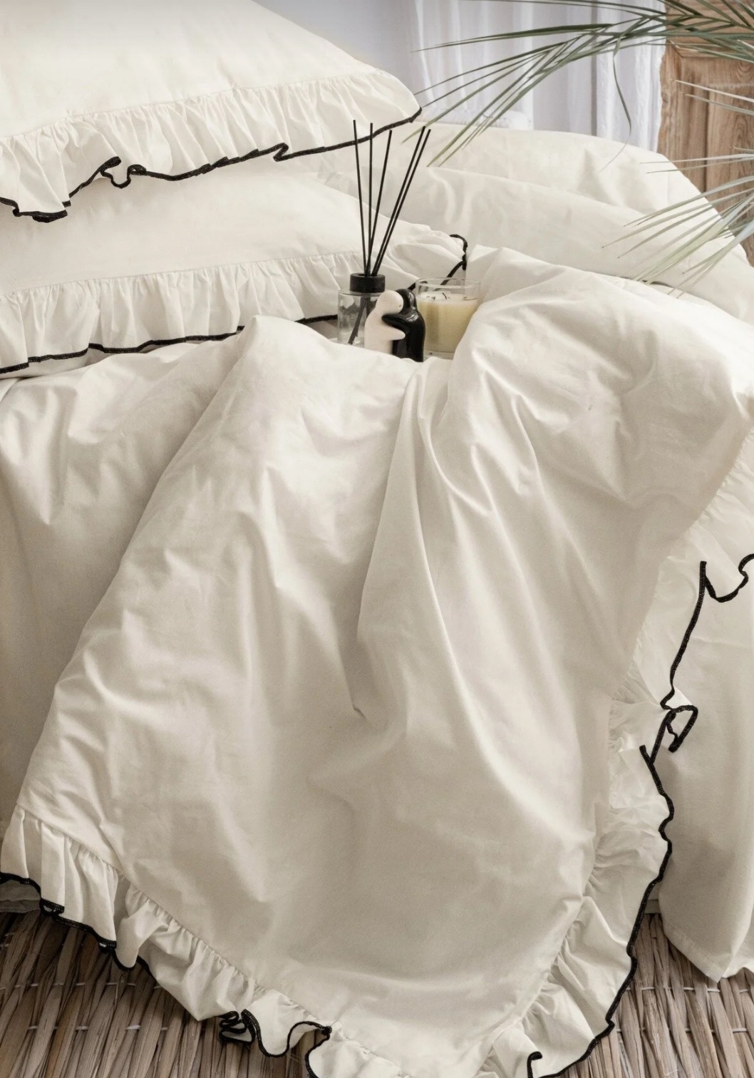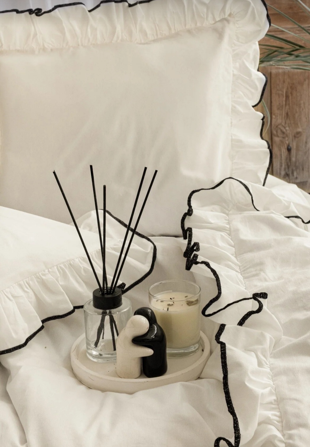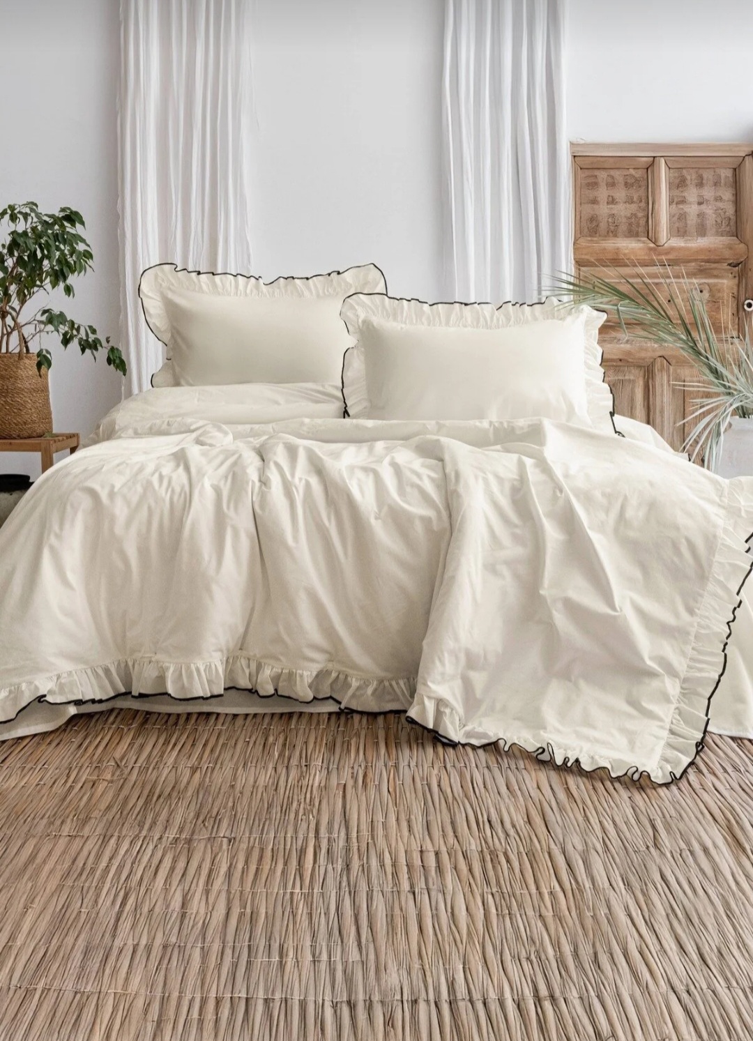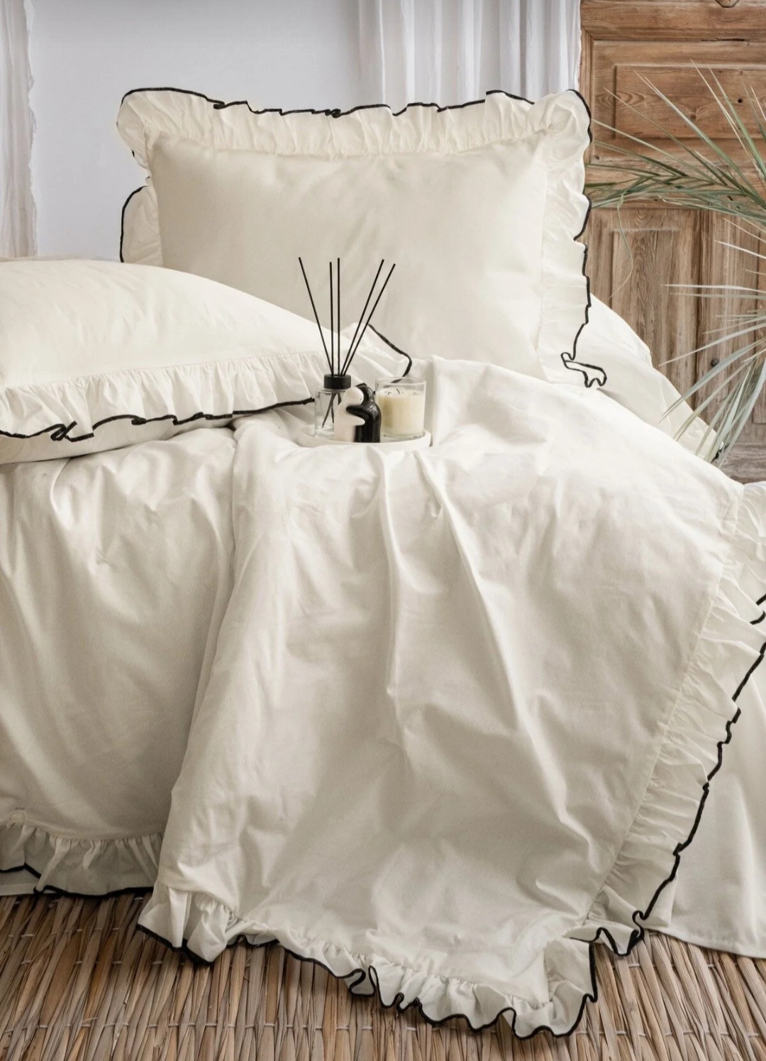 Kırık beyazın huzur veren tonu, odaya doğal bir aydınlık hissi kazandırır. Kenarlarda yer alan ince siyah şerit detayı, sade tasarıma modern bir dokunuş ekler. Fırfır detayları ise romantik bir stil arayanlar için ideal bir görünüm sunar. Bu detaylar nevresime hareket katar ve ürünü sıradan seçeneklerden ayırır.